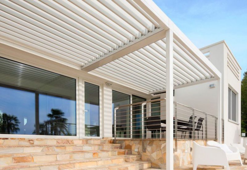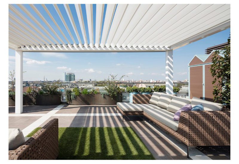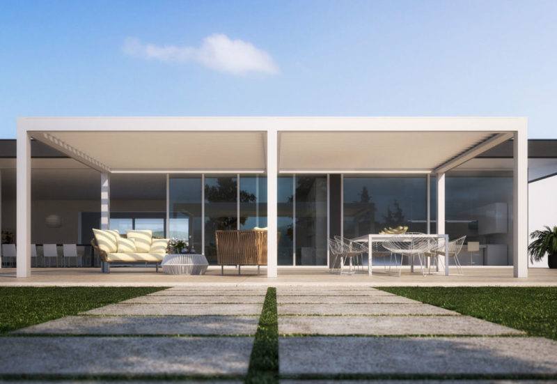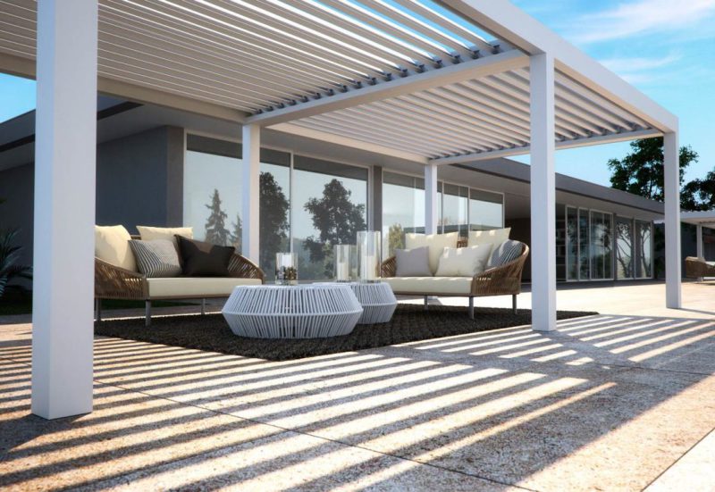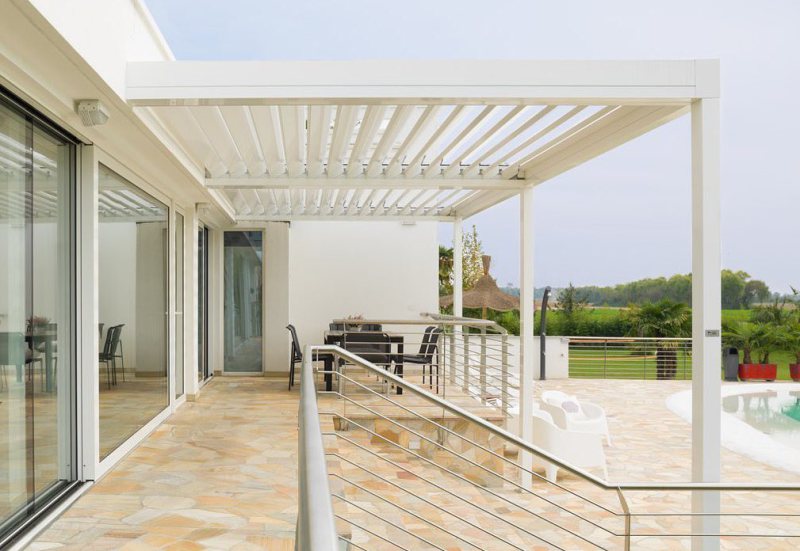 nasce con profili piu' contenuti rispetto alla sorella maggiore Opera.Gli elementi strutturali seguono una linea minimal ed essenziale che riduce l'impatto estetico,senza rinunciare alla funzionalità. Gronda perimetrale con raccolta acqua integrata nei montanti. Copertura a lamelle in alluminio orientabili da 0° a 140°, complete di guarnizioni e gronde scarico acqua laterale. In base all’orientamento delle lamelle, la struttura, offre protezione totale o parziale dal sole, una perfetta climatizzazione, e un sicuro riparo dalla pioggia divenendo uno spazio da vivere sempre. Dimensioni massime realizzabili in modulo unico fino a L 5.00 x SP 6.90 mt. con solo quattro/sei montanti perimetrali Funzionamento esclusivo a motore lineare a bassa tensione. La struttura, offre optional aggiuntivi, come luci LED o tende perimetrali, in grado di creare sinergie tra il nuovo ambiente e quello circostante, che generano nuove soluzioni ogni volta originali e personalizzate.Disponibile anche il sistema di illuminazione a led con faretti.