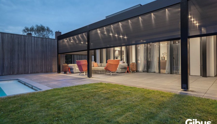 Pergotende con copertura impacchettabile, in tessuto PVC oscurante resistente agli UV e impermeabile. La struttura in alluminio si caratterizza per le travi orizzontali, perpendicolari alle gambe, che non richiedono inclinazione per il drenaggio dell’acqua piovana.La copertura drena l’acqua meteorica verso la struttura perimetrale grazie al caratteristico sistema arcuato dei profili frangitratta di sostegno del telo. La grondaia di raccolta è integrata nella cornice perimetrale e lo scarico a terra dell’acqua è integrato nelle gambe.Grazie al materiale tecnico a tre strati, il tetto delle pergole crea uno schermo totale, protegge dalla pioggia ,dal sole e raffresca l’ambiente sottostante.Se lo desideri, la Pergotenda puo' essere integrata con chiusura laterali quali vetrate o tende tecniche per oscurare, ombreggiare o proteggere inoltre puo' essere accessoriata con illuminazione a Led Spot, integrata nei frangitratta o anche nel perimetro della struttura.
