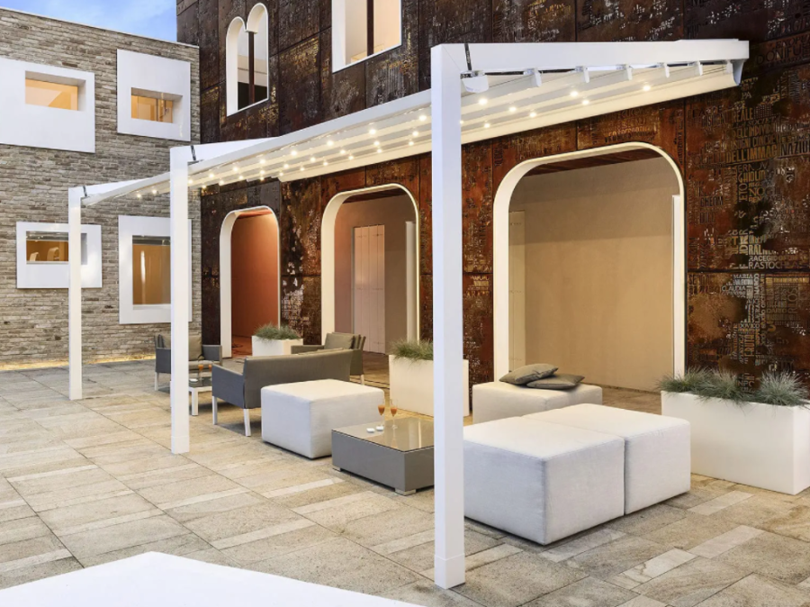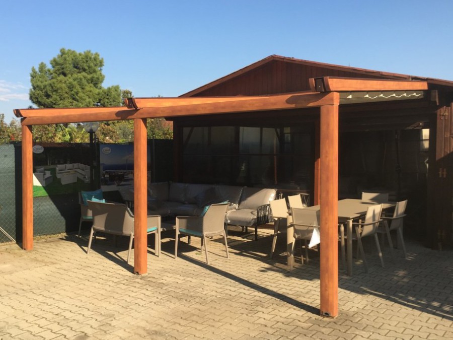 La PERGOTENDA e’ una struttura in alluminio o in legno addossata alla parete sostenuta da due o piu’pilastri a seconda della sua larghezza.LA PERGOTENDA e’ composta da un telo scorrevole orizzontale ,teso quando e’ aperto ed impacchettato quando e’ chiuso,realizzato con pvc oscurante che protegge dai raggi solari uv e dalle alte temperature oltre che naturalmente dalla pioggia. L'acqua piovana infatti ,grazie alla pendenza con la quale e’ montata la pergotenda,confluisce ,tramite un’apposita grondaia in alluminio, nei pilastri portanti della pergotenda stessa che a loro volta la scaricano a terra.La movimentazione del telo della PERGOTENDA,tramite un sistema di guide in alluminio e carrelli scorrevoli, puo’ essere o manuale con arganello oppure attraverso motorizzazione elettronica gestita da radiocomando.LA PERGOTENDA e’ dotata inoltre di un robusto tettuccio di protezione in alluminio che consente il riparo del telo quando e’ chiuso: IL CEPPO ROMA dal 1993 fornisce e vende PERGOTENDA A ROMA, guarda i nostri prodotti e trova la tua PERGOTENDA ideale.